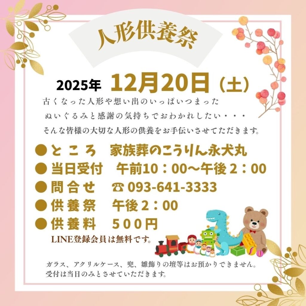 冬本番を目前に、寒い日がつづいております。この度、12月20日(土)こうりん永犬丸にて、人形供養を開催いたします。長年大切にしてきたお人形やぬいぐるみを、感謝の気持ちを込めてご供養いたします。岡田神社様のご協力のもと、厳かに執り行わせていただきます。また、当日は 耳ツボジェリー体験(有料) も行っておりますので、ぜひあわせてご利用ください!